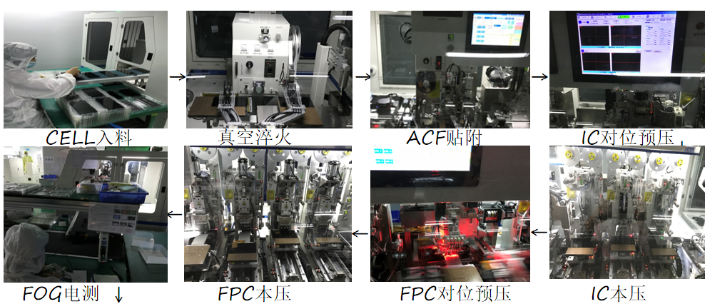 7.COG-FOG生产是FOG成品的关键工序,从小片进入到设备上开始,等离子清洗ITO线路(真空淬火)-ACF贴附-IC对位预压-IC本压----FPC本压等工序,在一台全自动设备上完成。