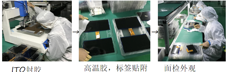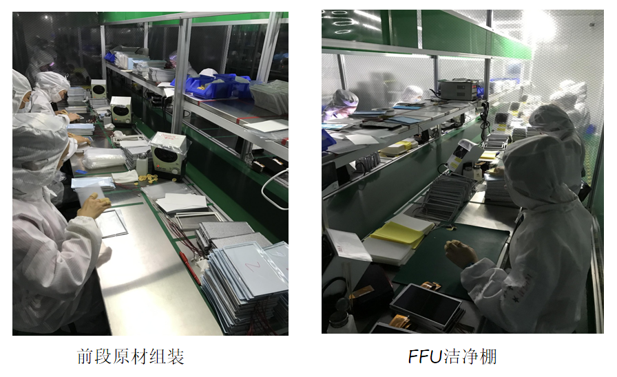1.B/L组立前段原材组成,LED+PCB,反射膜,导光板,下铁,扩散膜,上下增光,DBEF等膜材组成BL半成品,在FFU洁净棚里组装模组增加洁净度。