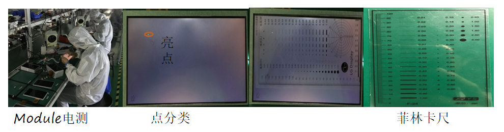 2.Module电测分类,红 绿 蓝 黑 白 彩条 灰阶 彩图等界面有效的点类,线类照TFT检查标准作业指导书区分(菲林卡尺判定)。